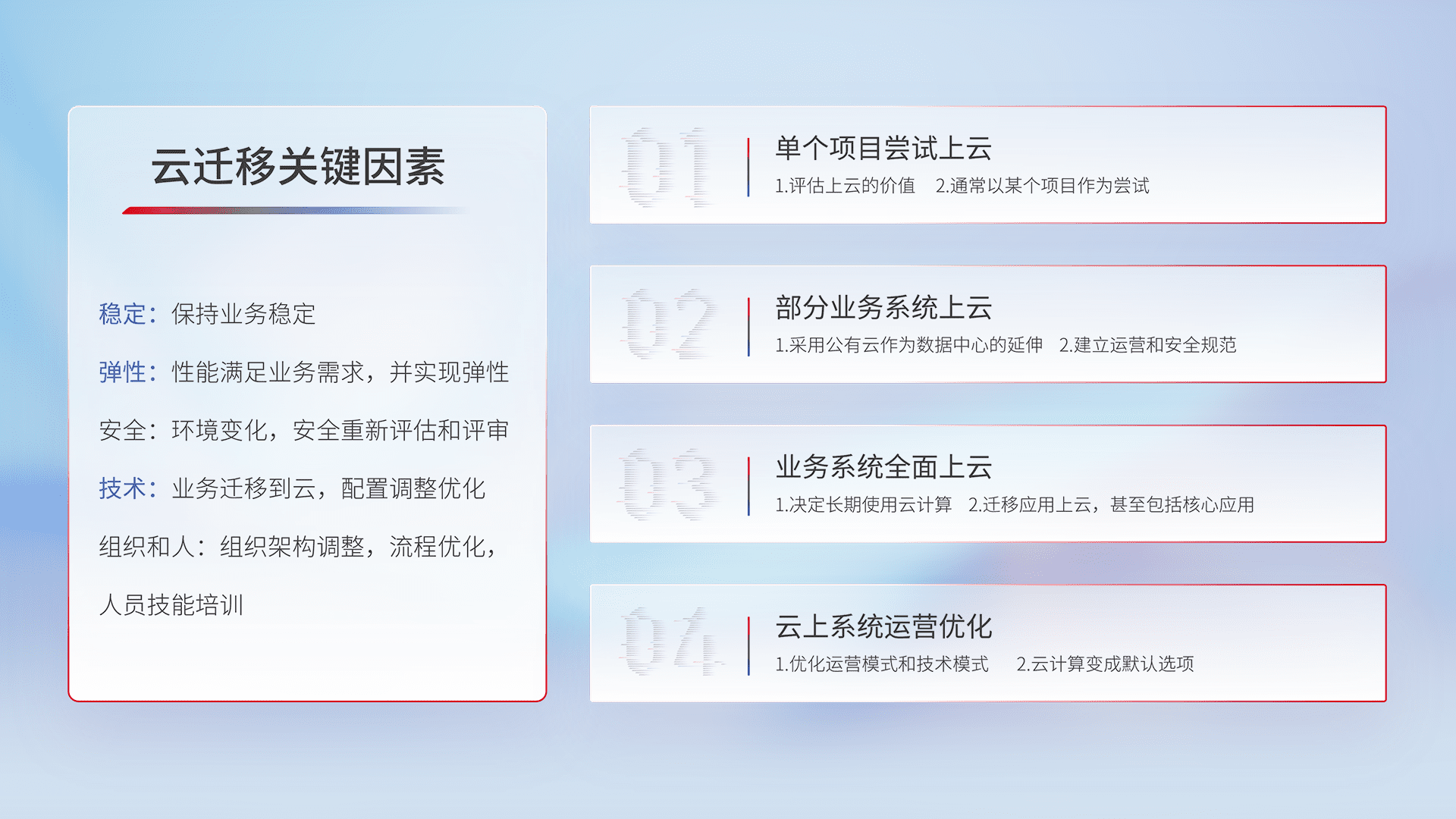 结合实际业务,,,从规划设计、、、、云平台选型、、云原生改造、、、、数据迁移、、集成交付,,,,迁移全过程为客户识别最佳上云路径,,做好风险识别管理,,设计网络架构、、、、身份权限、、、、安全审计合规、、、、操作审计、、、、日志审计、、监控告警策略、、多站点容灾设计等,,,,对云上基础设施进行整体规划,,,,提升IT治理水平,,以满足弹性、、、高可用、、、、高性能的需求。。。。